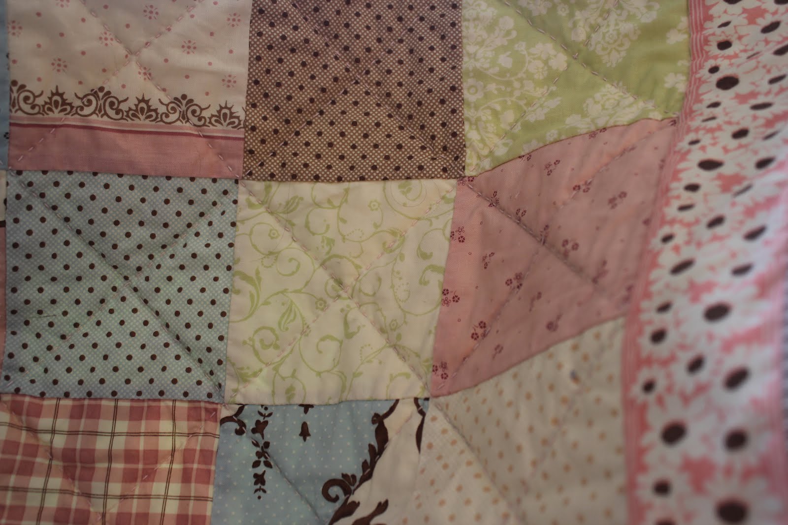 I bought this quilt as a kit from Primitive Patches, a gorgeous little quilt store not far from me. I'm not sure of the fabrics, I'm sorry. I was pregnant with my littlest one at the time. I was looking to make a unisex quilt but having already had two girls, I thought it was highly likely to have another.. This quilt caught my eye hanging in the shop and I knew I wanted to make it..........